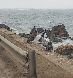 Danach geht’s endlich ans Meer, das wir nach 8 km erreichen. Ab jetzt führt uns eine kilometerlange Küstenstraße durch sehr urbanes Gebiet. Ein Hotelburg reiht sich an die anderen, dazwischen immer wieder Steilhang und Felsen, sehr schön. Im Wasser tummeln sich Surfer und SUP-Boardfahrer, auf den Felsen Pelikane und andere Seevögel.