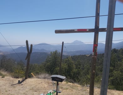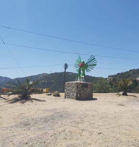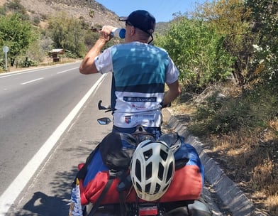 Also ran an die Steigung. Es geht bergauf, erst mäßig, dann immer steiler bis zu 10% müssen wir auf den nächsten 11 km bewältigen. Gut, dass wir genug Wasser dabeihaben, quasi jeder (eher rare) Schatten wir für eine Trink- und Verschnaufpause genutzt. Das radeln ist noch ungewohnt, das Gepäck schwer… ich muss teilweise sogar schieben. Anfangs haben wir uns über leichten Rückenwind gefreut, aber mit zunehmender Höhe spüren wir den Wind vom Meer her wehen und zwar genau gegen uns! Die letzten km tun noch mal richtig heftig weh! Oben angekommen am Pass ist es schon 14 Uhr. Leider steht da noch nicht mal ein Passschild zum fotografieren. Auch die Abfahrt dauert länger als geplant; weil es so steil bergab geht und so warm ist laufen die Bremsen heiß, wir müssen Kühlpausen einlegen.