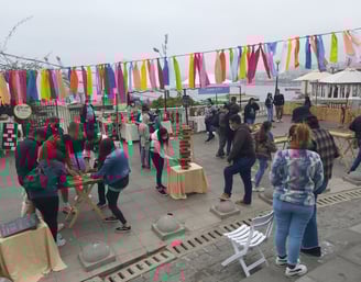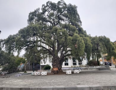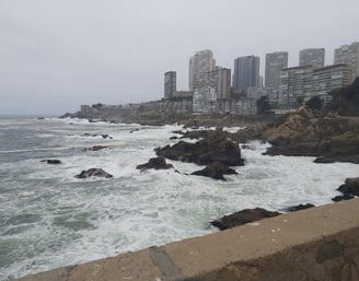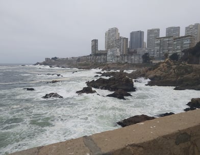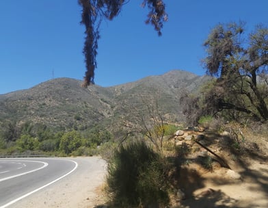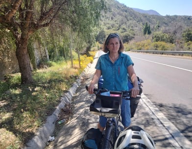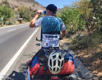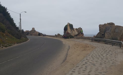 In aller Früh sind wir in Santiago Richtung Meer aufgebrochen, noch bevor es wirklich hell war. Nautische Dämmerung nennt sich der Zustand, wenn die ersten Sterne verblassen. Unser Plan sieht vor, die Fahrradautobahn unten entlang des Rio Mapocho stadtauswärts zu nehmen. Was wir nicht wussten: Auch Radwege können Öffnungszeiten haben, und hier beginnen diese ganz entschieden nach 6 Uhr morgens…. Nicht schlimm, der Verkehr hält sich noch in Grenzen und auch oberhalb des Flußes gibt es Radwege und Parkwege, so dass wir fast ohne Autoberührung aus dem gröbsten Stadtgebiet hinausgelangen. Dann wird es erst mal ungemütlich: Die Ausfallstraße an der Stadtgrenze, ist laut, dreckig, vermüllt, stark befahren, stinkt. Ein internationales Phänomen. Nach ca. 15 weiteren km wird langsam schöner, die Landschaft hügelig, der Verkehr lässt deutlich nach. Im ersten Dorf gibt es auch Stände mit Kaffee und Tee und wir greifen dankbar zu. Für beides bekommen wir je einen Becher mit heißem Wasser gereicht, in das wir wahlweise Teebeutel oder Nescafe rühren dürfen. Milch: gibt’s nicht. Geht aber auch ohne. Frisch gestärkt radeln wir weiter Richtung Berge, es wird immer schöner und idyllischer. Und heißer! Als wir den Fuß unseres Passes über die Küstenkordillere erreichen ist es fast Mittag. Unterwegs begegnen wir Scharen von Rennradfahrern, mutmaßlich aus Santiago. Es ist Samstag, da wird Sport getrieben wie bei uns! Wir werden vielfach von ihnen angefeuert auch mal nach Richtung und Ziel befragt, Ein Radler bittet sogar um ein Selfie mit uns. Das tut natürlich gut.