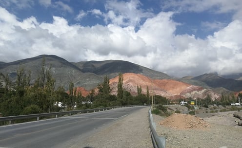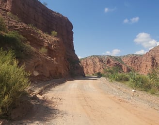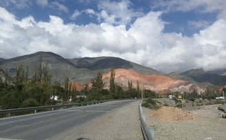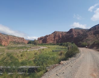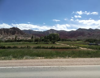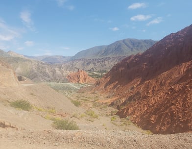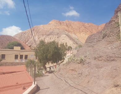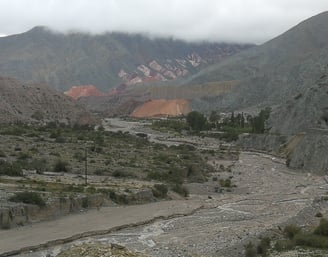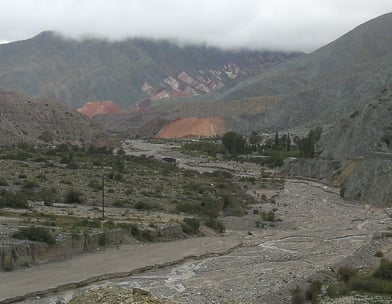Der anfänglich sanfte Rückenwind wird mit der Mittagshitze immer stärker und treibt uns vorwärts. Trotz der sanften Steigung und der inzwischen beträchtlichen Höhe von über 2500HM kommen wir deshalb schnell voran. Als wir nach 42km Huacalera erreichen, ist es immer noch früh und der Ort so klein und so wenig ansprechend, dass wir hier nicht bleiben wollen. Also entschließen wir uns, gegen den Plan bis zum Ort Humahuaca durchzufahren. Die Landschaft in der Quebrada de Humahuaca ist durchgehend von den bunten Felsformationen geprägt, die wir schon in Purmamarca bewundert haben. Das Fahren macht einfach Spaß! Auch der Verkehr, der am Anfang mörderisch war, wird nach Tilcara deutlich weniger. Die meisten Touristen machen hier Halt.