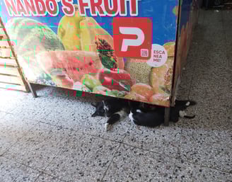 Neue Freunde in der Stadt: eine Katze säugt ihre Jungen unter dem Ladentresen