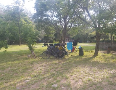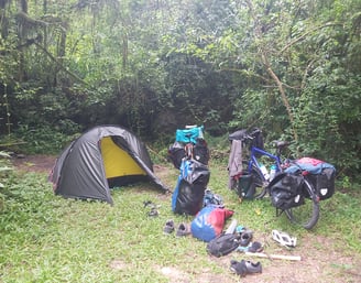 Unser Nachtlager liegt verborgen im Grünen zwischen Rio Angustura und Straße