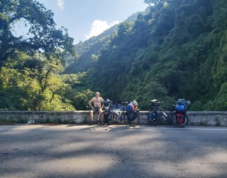 Wir stehen um kurz nach sechs auf, aber dennoch sind wir erst kurz vor acht auf der Straße. Es liegt eine Steigung von über 2000 Höhenmetern vor uns! Es ist bereits ziemlich warm, und schon jetzt drängen jede Menge Wochenendausflügler das Tal hinauf. Noch ist es schattig, und trotzdem drehen sich die Pedale nicht leicht. Bald dringt die Sonne ins Tal vor, und jetzt läuft uns das Wasser schneller aus den Poren, als wir es nachfüllen können.