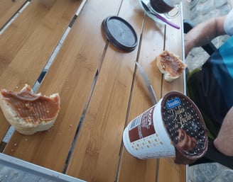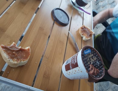 Frühstück am Kiosk mit Brot, Aufstrich und Kaffee. Verblüffenderweise kostenlos.