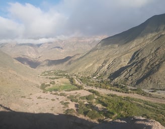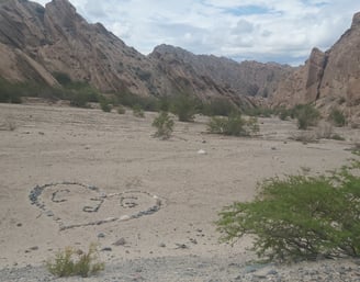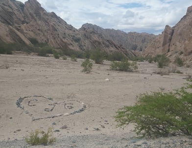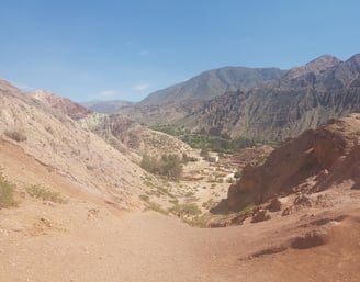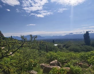 Umtriebig, wie ich angeblich bin, mach ich natürlich in den zwei Tagen unseres Aufenthaltes einige Ausflüge. Gleich Dienstagmorgen radele ich an den Fuß der Anden, wo es Höhlen mit uralten Malereien geben soll. Ich schließe mich dort angekommen einer Gruppe von drei Damen aus Buenos Aires an, die gerade mit einer Indioführerin losziehen wollen. Wir haben viel Spaß unterwegs und unterhalten uns lebhaft. Von der Führung verstehe ich ungefähr die Hälfte, für den Rest reichen meine Spanischkenntnisse noch nicht. Auf der Wanderung nach oben zu den Höhlen haben wir eine wunderbare Sicht ins Tal. Victoria, die nette Führerin, erzählt uns neben allem Wissenswerten zu den Höhlenmalereien auch viel Interessantes über die hier noch in abgeschiedenen Bergregionen lebenden Indiofamilien.