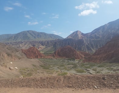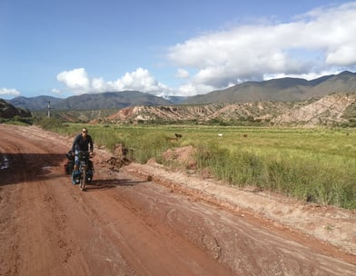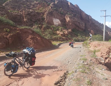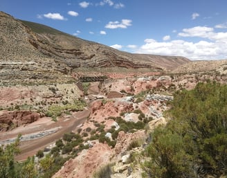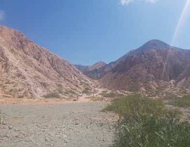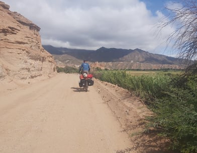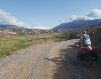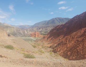 Es war klar, dass die heutige Etappe hart werden würde, auch mit Unterstützung durch Rückenwind. Da wir im Hostal kein Frühstück bekommen, kochen wir Tee und essen die restlichen leckeren Hörnchen aus Purmamarca. Kurz nach acht sind wir unterwegs. Es ist wolkenlos blauer Himmel und saukalt, und ab dem ersten Meter geht es bergauf. Da in der Früh noch kein Wind geht, kurbeln wir schön langsam dahin. Und auch wenn wir schon die ganze Woche in diesem Tal unterwegs sind, müssen wir immer wieder anhalten und Fotos machen, weil uns die bunten Felsen begeistern.