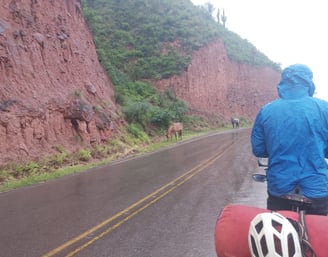 Es geht sehr sanft bergauf, aber wir sind beide so erschöpft, dass wir die ganze Zeit abwechselnd Windschatten fahren und alle 10km anhalten zum Verschnaufen. Schon bald kommt etwas Nordwind auf, aber wir schaffen etwa 17km/h. Wir fahren durch eine riesige Hochebene, die auf 3.500m dank der Regenzeit intensiv grün ist. Überall steht das Wasser, die Böden sind gesättigt, und so weit das Auge reicht grasen Lamas, Ziegen, Schafe und Kühe. Inzwischen ist der Autoverkehr so schwach geworden, dass wir immer problemlos überholt werden können, was gut ist für unsere Nerven. Nach etwa 30km wird die Steigung etwas stärker, und zugleich verstärkt sich der Wind stetig. Für mehr als eine Stunde halten wir auf eine Baumgruppe am Horizont zu, die einfach nicht näher kommen will. Als wir sie erreichen, gibt es keinen Horizont mehr. Man sieht etwa 1km Straße, und dahinter ist Himmel. Wir fahren auf den Himmel zu und erreichen so irgendwann den Punkt, an dem die Steigung in sanftes Gefälle dreht.