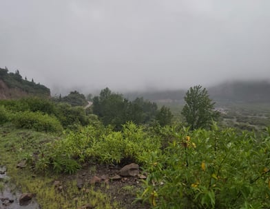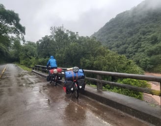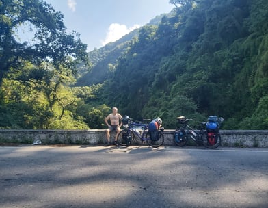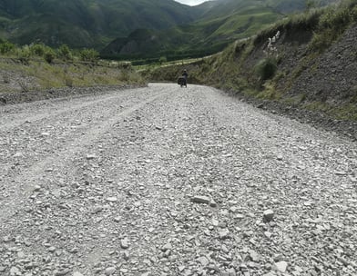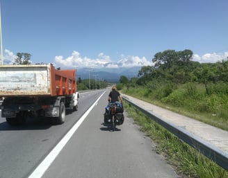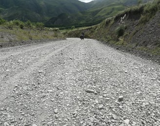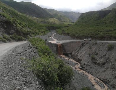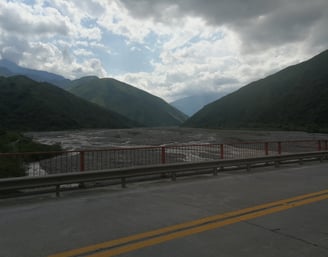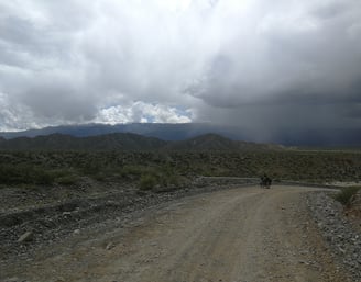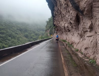 Anfangs haben wir noch einen tollen Blick ins Tal, dann wird aus der leichten Bewölkung Nebel, irgendwann beginnt es zu regnen, und auf der Passhöhe fehlt nicht viel zum Schneefall. Unsere Hoffnung auf tolle Gipfelblicke und dass wir auf der anderen Seite in die Sonne hinunterrollen können, erfüllt sich nicht. Im Gegenteil: hier tobt ein heftiger Wind, es regnet und gewittert, und auf den nächsten Kilometern ist die Straße vielerorts von Schlamm und Erdrutschen bedeckt. Zum Teil müssen wir uns unterstellen, so heftig ist das Wetter. Mühsam bahnen wir uns den Weg gegen Wind und Regen. Die Straße auf dieser Seite des Bergs ist lausig, es schüttelt uns heftig durch.