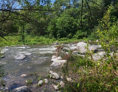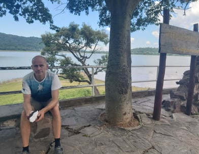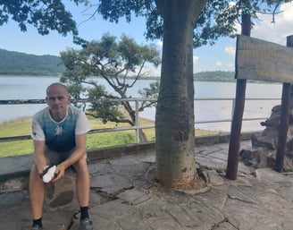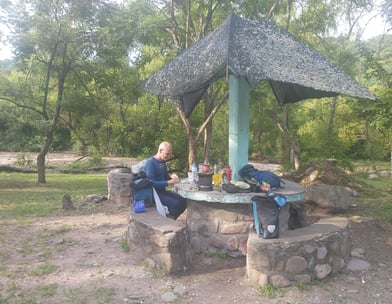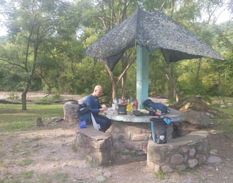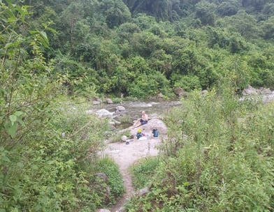 Es ist ab Mittag heiß und schwül: Wir trinken viel und machen dann Siesta am Flussufer im Wald