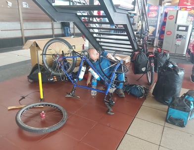 Für die nächsten anderthalb Stunden richten wir uns dann in einem Winkel des Busbahnhofs ein. Die Fahrradkisten werden ausgeräumt, das ganze Gepäck aus unserem Seesäcken wieder auf Satteltaschen verteilt und die Räder montiert. Übrig bleiben die Kartons, für die Conni schnell Abnehmer findet; sie werden wohl den nächsten Radfahrern verkauft. Und dann sind wir endlich wieder autark! Wir besteigen die Räder, radeln in Richtung Innenstadt, und im ersten Hotel, das wir finden, ziehen wir ein und schlafen uns aus. Am Abend machen wir noch eine kleine Tour durch die Stadt, essen super billig, planen die kommenden Etappen und gehen endlich schlafen.