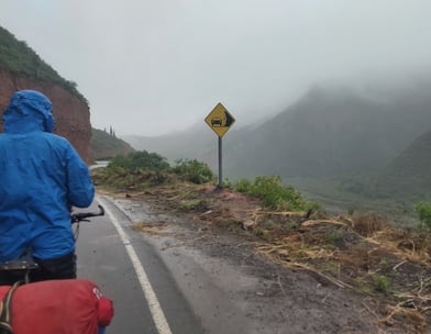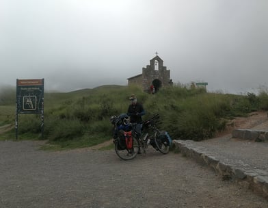 Schleichend wird die Straße steiler, bei ungefähr der Hälfte der Strecke fahren wir in die Wolkendecke hinein und verlieren die Aussicht. Aus dem dichten Nebel wird schleichend ein dünner, aber steter Regen, und es wird kalt. Also ziehen wir nach und nach immer mehr an und hoffen, dass wir oben aus den Wolken hinausfahren können. Die Fahrt wird immer langsamer. Irgendwann wird klar, dass mindestens mir die Auffahrt zum Pass alles abverlangt und die Weiterfahrt zum Salar nicht möglich sein wird. Und auch die Hoffnung auf Sonne am Pass erfüllt sich wieder mal nicht. Die letzten Kilometer ziehen sich endlos, der Wind wird stärker, ich rechne dauernd damit, dass der Regen zu Schnee werden könnte.