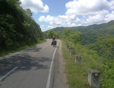 Wir stehen kurz nach sechs auf, frühstücken und sind kurz nach sieben auf der Straße. Unsere Erwartung, dass die Straßen leer sein würden, geht nicht auf, es ist regster Betrieb. Unsere Strecke ist weitgehend flach, wir sind extrem ausgeruht, und so fliegen sie Kilometer an uns vorbei. Mit einem Schnitt von über 20 Km/h haben wir den Abzweig in die Berge nach weniger als 3 Stunden erreicht. Aber dann wird es mit einem Mal zäh. Der leichte Wind kommt jetzt von hinten und bringt keine Abkühlung mehr, die Sonne steht hoch und brennt runter, die Luftfeuchtigkeit ist bei 100% und die Straße steigt leicht an. Schon nach wenigen Klometern werden die Stopps im Schatten häufiger, an einem Kiosk kaufen wir Bier, Saft und Wasser und trinken alles gleich leer.