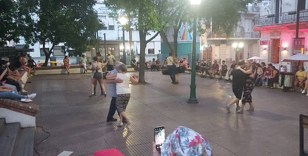 Nach einem Schläfchen gehen wir abends nochmal raus auf die Plaza Dorrego, denn hier wird am Abend Tango getanzt, ganz ohne Showeffekte und Eintritt. Es wird mit einer kleinen Anlage Musik gespielt, und ganz normale Paare tanzen zu ihrem und unserem Vergnügen. Von Anfängern bis zu fast professionellen Paaren reicht die Bandbreite. Mehr als alle anderen Paare begeistert aber ein großer schlanker Mann mit seiner Partnerin im Rollstuhl die Zuschauer. Ob es die selbstverständliche Eleganz ihres Tanzes ist oder die unübersehbare Harmonie zwischen ihnen, jedenfalls tobt das Publikum. Wir können uns nicht losreißen und bleiben bis zum Schluss. Kaum sind wir im Haus, bricht wieder der Regen los.