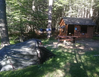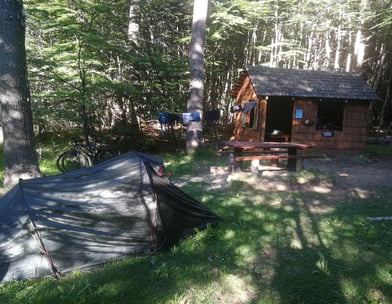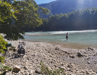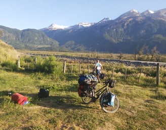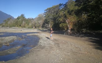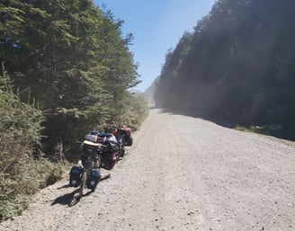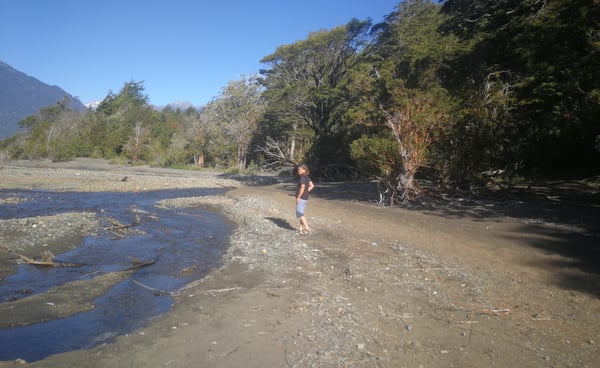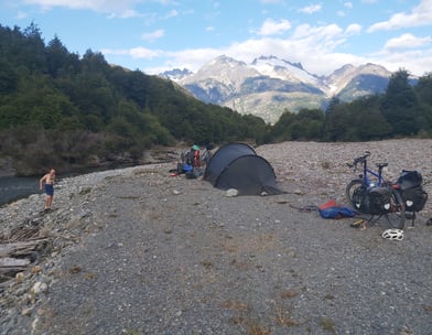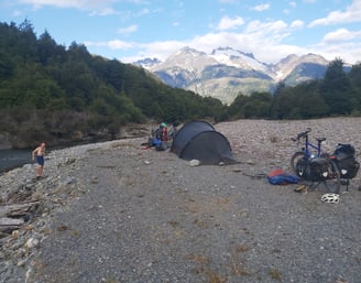 Zunächst ist die Straße wieder schlecht und langweilig. Aber bald setzt sich der Urwald mehr und mehr durch. Die 300HM der Abfahrt haben uns aus der kargen Bergwelt in einen Regenwald mit schneebedeckten Gipfeln ringsum versetzt. Die Schönheit der Landschaft, kombiniert mit dem Bewusstsein, dass die Anstrengungen der Carretera jetzt fast vorbei sind, wir unseren Endpunkt tatsächlich aus eigener Kraft erreichen werden, treibt uns die Tränen in die Augen, und wir lassen uns treiben. Mitten im Wald verkauft uns eine Frau zwei frisch gebackene Brote für 1.000 Pesos und schenkt uns noch ein Glas Marmelade dazu. Irgendwann träume ich davon, einfach immer weiter durch die Nacht zu fahren, bis wir in Tortel sind. Aber ein kleiner Anstieg im tieferen Schotter macht uns klar, dass wir eigentlich ziemlich mit den Kräften am Ende sind. Als wenig später ein Zugang zum Fluss mit einer ebenen Kiesfläche auftaucht, bauen wir dort unser Zelt auf, waschen uns im Fluss, und als Conni gerade das Essen fertig hat, beginnt der Regen. Wir flüchten mit Essen und Tee ins Zelt, gratulieren uns zum Timing und schlafen wenig später.