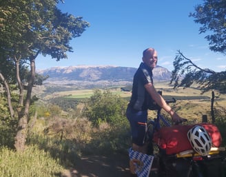 Auf den ersten 9km schleichen wir uns nur 150HM hinauf, dann wird es ernst. Die nächsten 6km sind so steil, dass wir sie immer nur in kurzen Stücken radeln können. Das ist perfekt für Tábanos, die sich für unser Blut interessieren. Um sie loszuwerden, muss frau sich schneller bewegen, als es der Berg erlaubt. Und so müssen wir während des gesamten Aufstiegs neben treten und schnaufen auch noch Bremsen töten oder kleine Verzweiflungstänze aufführen, wenn gerade wieder mal ein halbes Dutzend von ihnen gleichzeitig angreift. Als wir oben sind, sind wir schon ziemlich mitgenommen.