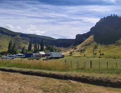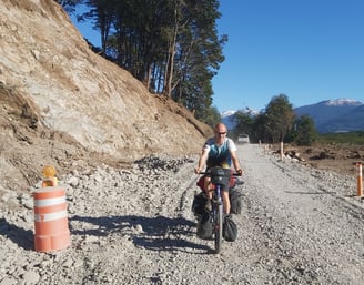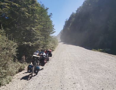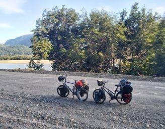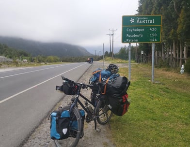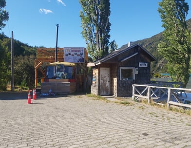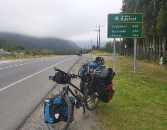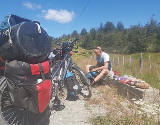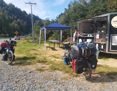 Nach einem kargen Frühstück (1 Tee, 1 Kaffee, 5 Kekse für jede) packeln wir auf und machen uns auf den Weg nach Puyuhuapi. Es ist unser siebter Tag auf dem Rad ohne Pause, für die nächsten zwei Tage ist Regen angekündigt. Zwei gute Gründe für die nächsten Pausentage, und Puyuhuapi ist der größte Ort hier. Nach nur 6km auf der Straße hat ein Foodtruck tatsächlich um diese Stunde schon offen! Wir können nicht widerstehen und ordern Tee und zwei fette Sandwiches mit Huhn, Palta und Tomate, die uns für den ganzen Tag satt machen.