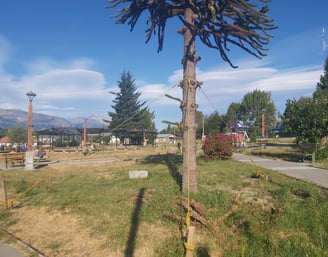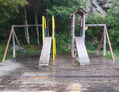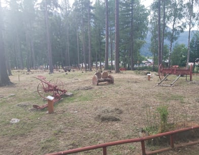 Beim abendlichen Spaziergang stellen wir dann fest, dass es am Ortsrand einen mehrere Hektar großen Park gibt, mit Wegen und Bänken, Spiel- und Trainingsgeräten, Einer Ausstellung historischer Landwirtschaftsmaschinen und einem Biketrail. Das alles mitten in ursprünglicher Bergwelt fanden wir erstaunlich. Gab es dafür freie Fördermittel? Wir erwandern den Park und weil Conni noch nicht genug hat auch noch ein kleines Stück einer auswärts führenden wunderbaren Bergstraße.