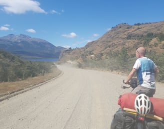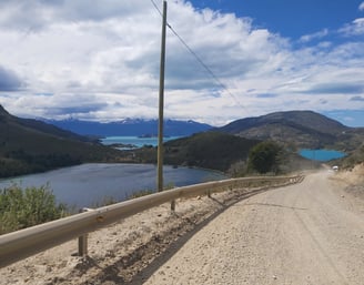 Der Abschied vom wunderbaren Rio Tranquilo fällt uns nicht leicht. Wir kommen auch mal wieder später los als gedacht, müssen noch mal umkehren, weil ich meine Trinkflasche vergessen habe. Die Stimmung ist gedrückt, wir wissen nicht recht, wie es am weiteren, sehr einsamen Weg wird, und zu allem Überfluss hat sich der Daniel beim Kajak fahren den Rücken gezerrt und hat bei jeder Bodenwelle Schmerzen. Und der kommende Weg hält viele Bodenwellen bereit! Es geht erst mal so richtig rauf und runter, mit Steigungen im zweistelligen Bereich, Waschbrettrillen in Dezimeterstärke und zum Teil zentimetertiefem losem Schotter. Wir kämpfen uns voran, der Blick auf den wunderbar blau glänzenden See in der Sonne und auf die fernen Gletscher des nördlichen Eisfeldes entschädigt für manches, aber nicht für alles. Zum Glück ändert sich die Bodenbeschaffenheit nach etwa 20 km und wechselt von hier ab alle paar km zwischen babypopoglatt und ärgerlich holprig, ist aber immer einigermaßen fahrbar. Die meiste Zeit haben wir heute Rückenwind, was auch hilft, die Laune zu heben. Wir fahren einige km durch ein sumpfiges Tal bevor es in die nächsten Steigungen geht. Zum Teil haben wir hier Ausblick auf gleich drei Seen in unterschiedlichsten Blautönen!