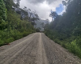 Für 10 Uhr morgens sind wir mit Christian verabredet, der uns über den Schotterpass Richtung Cisnes bringen soll. Um kurz nach neun steht er vor der Tür. Zum Glück sind wir schon fertig mit packen! Es wird ein ziemliches Gefummel, bis wir beide Räder und unser Gepäck in seinem Van verstaut haben, aber er ist völlig entspannt. Die ersten ca. 20km geht es auf bestem Asphalt am Fjord entlang und wir bedauern, dass wir hier nicht radeln können. Allerdings regnet es. Als dann der Schotter beginnt, überwiegt zumindest bei mir (Daniel) bald die Erleichterung. Die Landschaft wird immer spektakulärer und die Piste immer wüster, je tiefer wir ins Land eindringen. Die Passstraße schließlich erinnert eher an ein Flussbett in den Bergen, eingefasst von dichtestem Dschungel. Hier würden wir jeden Meter schieben, mit Connis Arm sogar die Strecke bergab. Ich ziehe meinen Fahrradhelm vor Jeder und Jedem, die diese Straße mit dem Rad bewältigt haben! Conni ist trotzdem traurig und blickt auf die wunderbare Dschungellandschaft, die sie nicht radeln darf.