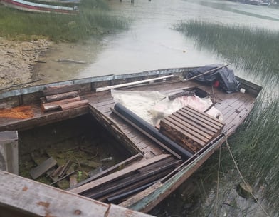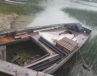 Am 1. Januar bleibt dann noch die schwere Arbeit, unsere Räder und das Gepäck den Berg runter zum Anleger zu schleppen. Es sind über 200 Treppenstufen, die wir 3x mit Fracht runter und 2x leer wieder hinauf gehen müssen und dann noch 1,5 km, die wir über rutschige Stege schieben müssen. Wir brauchen fast 2 Stunden. Und nochmal hält das Wetter zu uns: Es fängt pünktlich zu Schütten an, als wir am Anleger unter Dach sind. Dort warten schon weitere Radfahrer auf die Fähre, was das Warten zwar unterhaltsamer macht als erwartet. Als das Schiff kurz nach 22 Uhr um die Ecke kommt, sind wir trotzdem bis auf die Knochen durchgefroren.