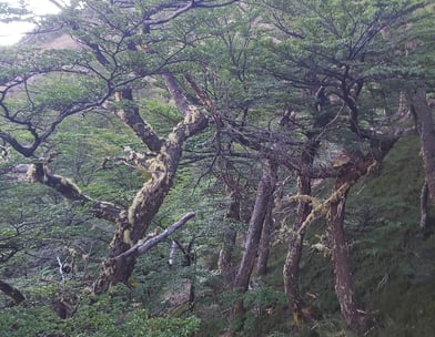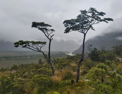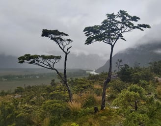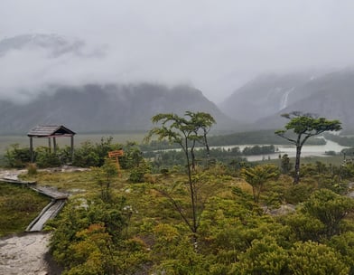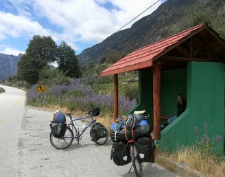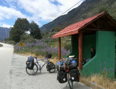 Die ganze Nacht stürmt und regnet es, in der Früh stärker denn je. Wir können uns nicht überwinden, in dieses Wetter rauszugehen, sondern drehen uns wieder um und schlafen weiter. Irgendwann hört der Regen tatsächlich auf, wir trauen uns raus. Während wir frühstücken und packen, kommt sogar gelegentlich die Sonne durch. Wir haben die Regensachen parat, und immer wieder wischt ein Schauer über uns hinweg. Aber auch auf dieser allerletzten Etappe auf der Carretera Austral bleibt uns das Wetterglück treu und wir weitgehend trocken. Einige Male stellen wir uns für ein paar Minuten in einem der Bushäuschen unter, die uns durch ganz Chile begleitet haben, bis die Sonne wieder durchbricht. Bei jeder Steigung spüren wir, dass wir reif für die nächste Pause sind. Aber die miese Wetterprognose treibt uns voran, der Wunsch, trocken nach Caleta Tortel zu kommen, ist stärker als die Massenträgheit. Einen Vorteil hat das schlechte Wetter: Keine Tábanos und kaum Straßenstaub, der Conni sonst oft schlimm die Augen reizt.