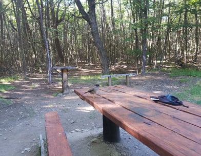 Noch einige Kilometer gibt es Übernachtungsangebote an Übernachtungs- und Essensgelegenheiten, aber ab Mittag ist es damit vorbei. Es wird einsam. Es geht stetig bergab, aber in ständigen Wellen, sodass wir kräftig strampeln müssen. Auch der Gegenwind hat sich wieder eingestellt, was Kraft kostet, aber die Tábanos fernhält. Als die Hitze zu schlimm wird, legen wir uns im Wald auf unsere Matten und schlafen eine Stunde.