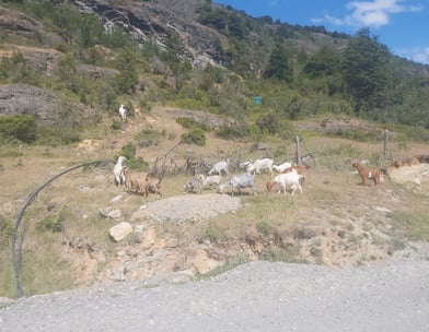 Wir rauschen den Berg hinunter zum nächsten Ort, Villa Santa Lucia. Hier hat ein Erdrutsch große Flächen verwüstet und Teile des Dorfs und der Straße mitgenommen. Bis Puyuhuapi werden das die einzigen 2km Schotter bleiben. Wir freuen uns auf ein Café, das aber leider geschlossen ist, und Conni jammert so malerisch über die Bremsenpest, dass eine Frau ihrer Tochter das Anti-Tábanos-Spray wegnimmt und ihr schenkt.