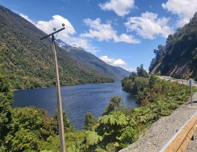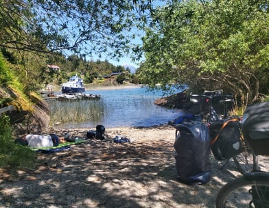Der restliche Tag ähnelt dem gestrigen: wellige Straße, Gegenwind, viel Natur und wenige Menschen. Es ist für den europäischen Blick verblüffend, stundenlang durch ein Naturschutzgebiet und dann entlang eines 10km langen malerischen Bergsees zu radeln, ohne ein touristisches Angebot zu finden. Aber diesmal wissen wir ja, dass im Ziel ein Bett auf uns wartet, und so radeln wir trotz aller Müdigkeit weiter. Immerhin geht es Richtung Meer, also wieder bergab!