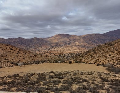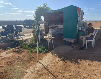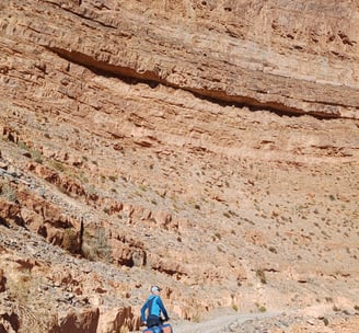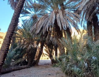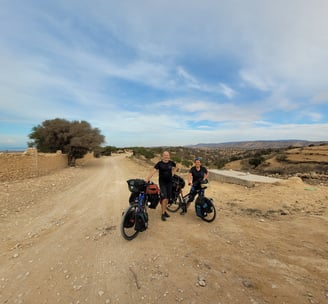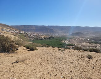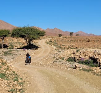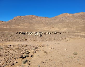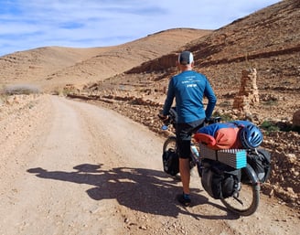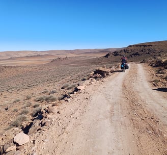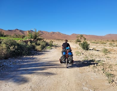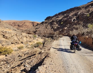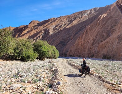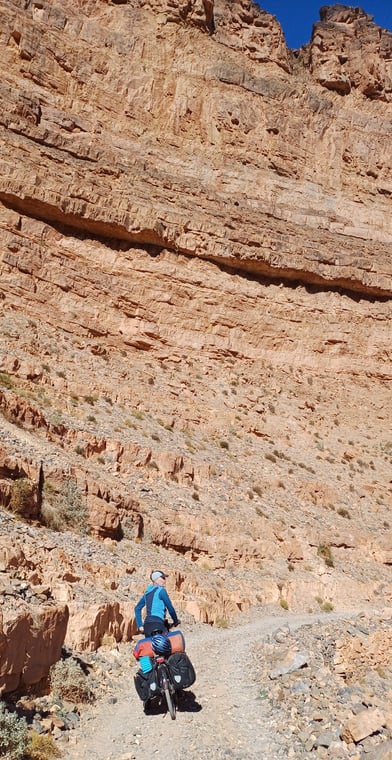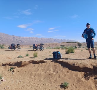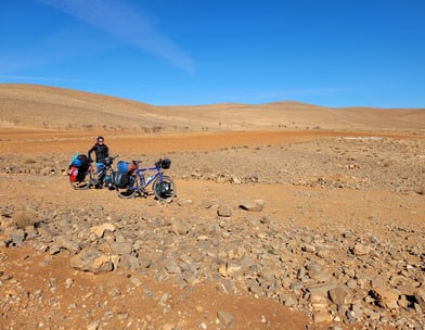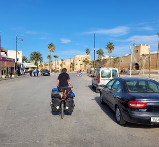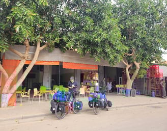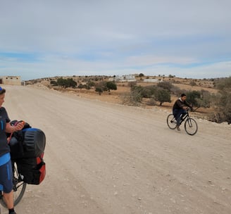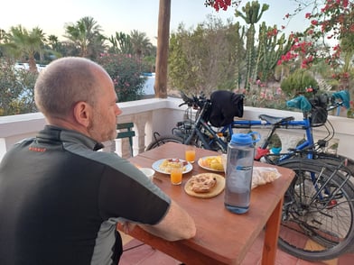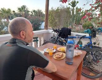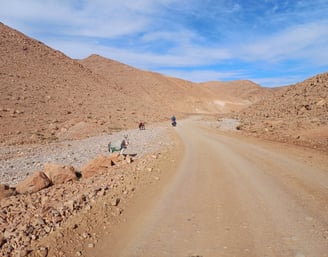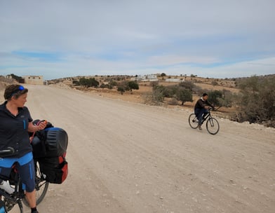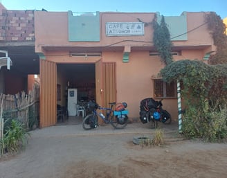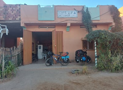 Mit dem Morgenruf des Muezzin verlässt der Onkel lärmend das Haus zum Beten. Als er wieder da ist, weckt er uns mit Tee, Kaffee, Brot und Marmelade, obwohl er weiß, dass wir nebenan ein Frühstück bestellt haben. Also frühstücken wir brav zweimal, nehmen dann herzlichen Abschied von den lieben Menschen, die uns aufgenommen haben, und radeln weiter. Heute wollen wir die gut 50km bis nach Tafraout Sidi Ali schaffen, wo die eigentliche Wüste beginnt. Von dort aus brauchen wir ein Auto, das uns zumindest die 30km bis nach Ramlia bringt, denn zwischen den Orten gibt es ein Flussbett mit Tiefsand, in dem wir vermutlich nicht einmal schiebend weiterkommen würden.