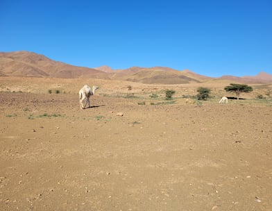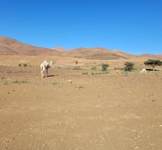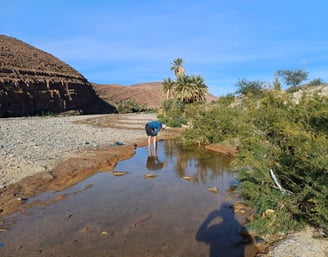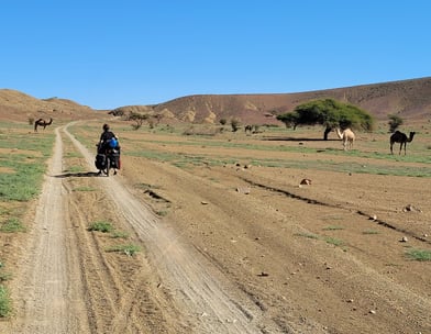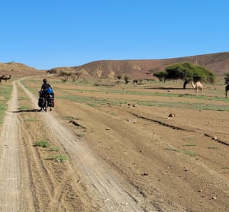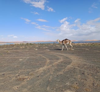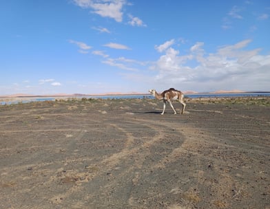 Der Abstieg geht schnell und macht viel Spaß, fast wie Skifahren. Wir machen uns gleich, schon ziemlich hungrig, auf den Weg zum Frühstück. Am späten Vormittag radeln wir dann in den Ort Merzouga, trinken Kaffee und schlendern. Danach mache ich mich auf den Weg zu einem nahen See, an dem es angeblich Flamingos geben soll. Der See ist von den üppigen Regenfällen im Herbst übriggeblieben und existiert nur etwa alle 25 Jahre, das will ich mir nicht entgehen lassen. Der Weg ist zumindest anfangs ziemlich sandig, weshalb der Daniel in unsere Unterkunft abbiegt, um noch zu chillen. Am See angekommen finde ich zwar keine Flamingos, aber immerhin viele Enten und ein Dromedar. Ich radle ein bisschen planlos umher und verirre mich hoffnungslos, was mich aber nicht aus der Fassung bringt, dafür meinen Kilometerstand um einiges nach oben treibt.