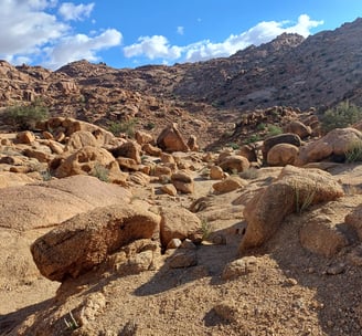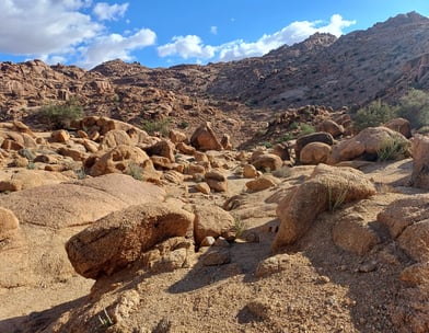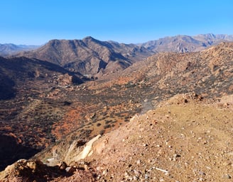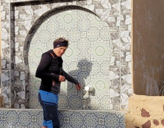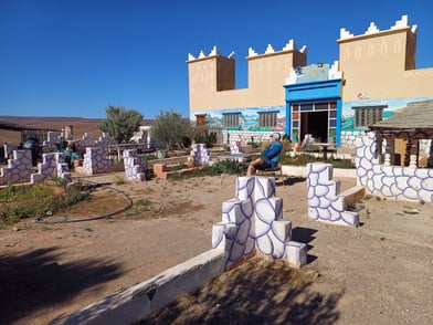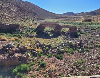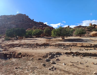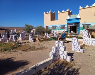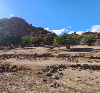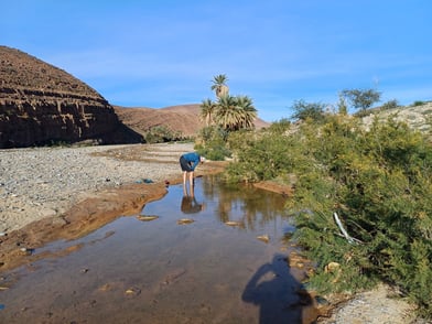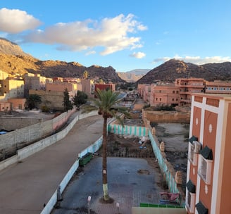 Irgendwann geht es dann wieder leichter, der Untergrund, ein kürzlich getrockneter See, trägt uns wieder, und wir rollen in Tafraout ein. Wir gönnen uns das teuerste Hotel am Platz, verfüttern die letzten Bonbons an die uns begleitende wilde Kinderschar, und der Manager macht sich auf die Suche nach einem Pickup, der uns morgen auf die andere Seite des Flusses bringt.