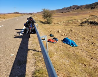 Die ersten Kilometer sind angenehm, aber nach und nach setzt der Wind ein und macht das Fahren schwer. Wir haben einen 33km langen Anstieg von nur 300HM vor uns, den wir eigentlich kaum spüren sollten. Selbst die steilste Stelle hat nur knapp 3% Steigung. Tatsächlich brauchen wir über drei Stunden für die Strecke, und als wir endlich oben sind, sind wir schon richtig platt. Der Wind bläst aber weiter und lässt uns auch in der Abfahrt kräftig treten. Irgendwann hocken wir uns in den Straßengraben, um ein bisschen Windschatten zu bekommen für unsere Essenspause. Conni schläft eine halbe Stunde, und dann machen wir uns an die letzten 12km Asphalt.