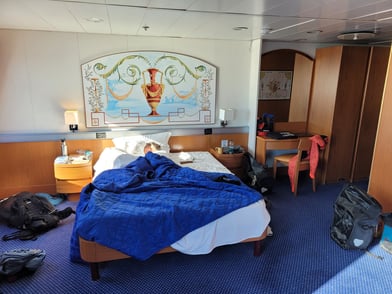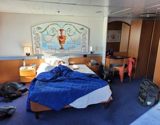 Checkin und Passkontrolle, und schon sind wir wieder in der wunderbaren Hochzeitssuite mit Blick in Fahrtrichtung aufs Meer, die wir auch beim letzten Mal bewohnt haben. Irgendwann springen auch die Motoren an und die Reise geht weiter.