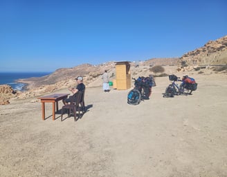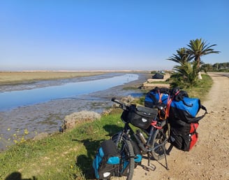 Danach ist es das erste Mal auf dieser Tour wirklich landschaftlich sehr schön, wir kommen an einer Lagune vorbei. Das Meer ist immer wieder zu sehen, Sanddünen begrenzen den Horizont. Leider bekommt Daniel ausgerechnet jetzt grässliche Bauchkrämpfe. Wir versuchen, mit Tabletten und Tee Abhilfe zu schaffen, aber es dauert eine Weile, bis wir wieder fahren können. Derweil kehren wir bei Hassan am Straßenrand ein, mindestens ich kann ja essen, und es gibt hier leckere Muscheln!