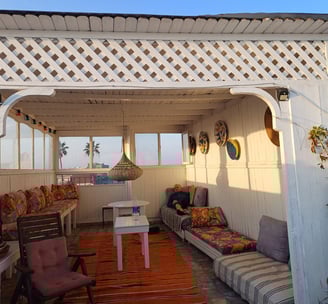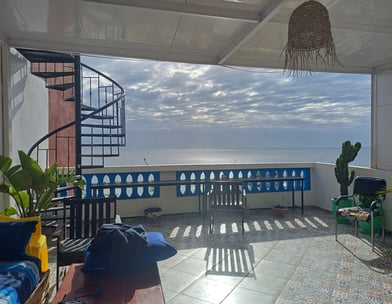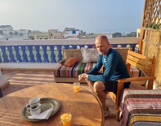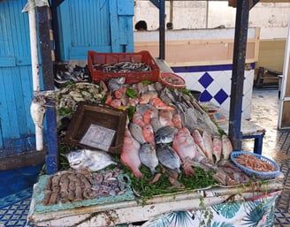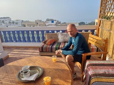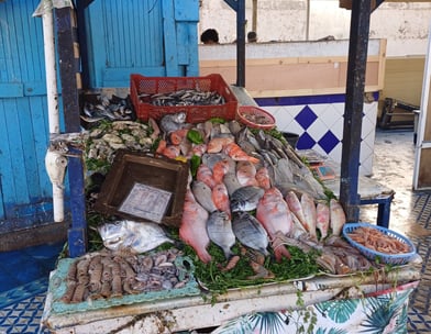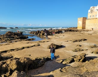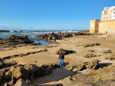 Schließlich erreichen wir die Medina, in der Conni sich schon eine winzige Pension ausgesucht hat. Wir telefonieren und whatsappen mit dem Vermieter, der wenig später kommt und uns einlässt. Wir duschen, genießen die letzte Sonne auf der Dachterrasse und wandern dann noch ein Wenig durch die Medina und ans Meer. Da Conni Lust auf gebratenen Fisch hat, steuern wir einen eher schlichten Schuppen mit ein paar Plastiktischen an und bestellen „einen kleinen Fisch vom Grill“. Zunächst bringt der Wirt einen Korb mit Brot und eine große Flasche Wasser. Bald darauf kommt eine Fischsuppe, die ich mehr aus Respekt esse, während sie Conni schmeckt. Als er uns dann zwei frisch gepresste Säfte hinstellt, beginnen wir uns zu fürchten. Daraus wird Panik, als er eine Schüssel mit geschmorten Crevetten und Fischstückchen in einer Soße aus Tomaten, Zitronen und Rosmarin serviert. Wir protestieren, dass wir das doch gar nicht bestellt hätten, worauf uns der Wirt auslacht und sagt, das gehe alles aufs Haus. Also essen wir auch das, und es ist so ziemlich das Leckerste, was wir ja in Marokko gegessen haben!