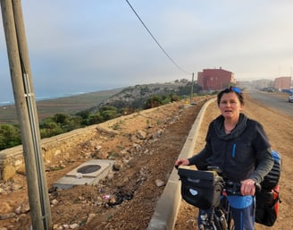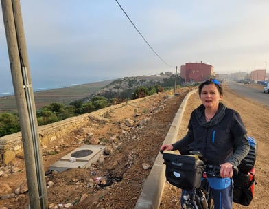 Aber schließlich gibt es nichts anderes mehr zu tun, als den Weg nach Tanger anzutreten. Der entpuppt sich trotz Rückenwind als viel härter, als ich ihn in Erinnerung hatte. Er ist für 36km eine einzige Abfolge von Anstiegen und Abfahrten bis an den Stadtrand von Tanger; erst dann wird es flach. Aber die Marokkanerinnen, die zu Dutzenden am Straßenrand ihre Verkaufsstände haben, feuern uns, eigentlich vor allem Conni, an. In völliger Verkennung der Fakten haben sie wahrscheinlich Mitleid mit ihr statt mit mir!