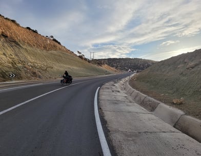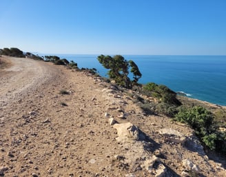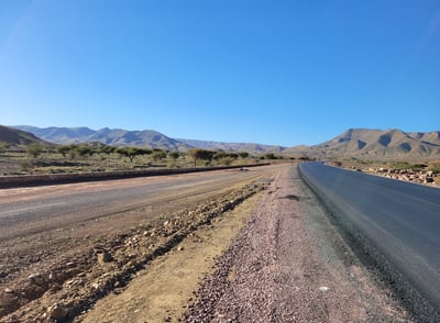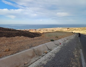 Irgendwann knickt die Küste nach Süden ab. Von hier an ist die Landschaft deutlich karger, Felder gibt es nur noch landeinwärts. Dennoch wird hier oben fleißig gebaut und auch der Teer wird gerade erneuert, was bedeutet, dass der Straßenbelag eher wieder in miesem Zustand ist. Aber da wir die Straße fast für uns haben, macht das wenig aus; es geht halt nur etwas langsamer, auch weil die Anstiege länger und steiler werden.
