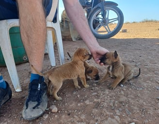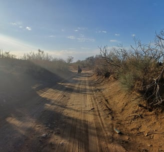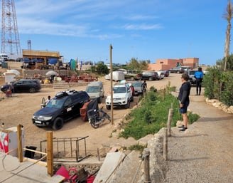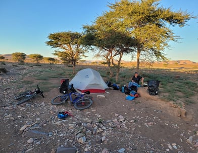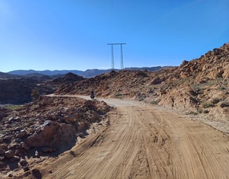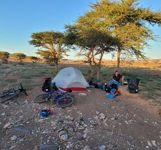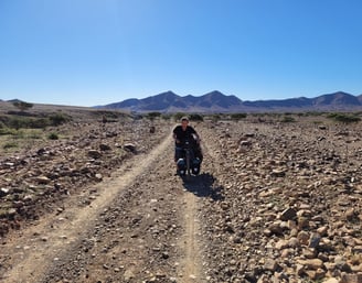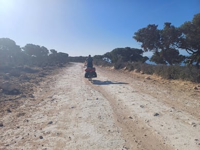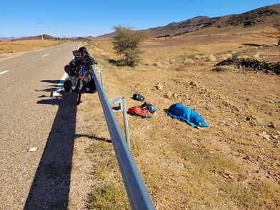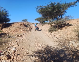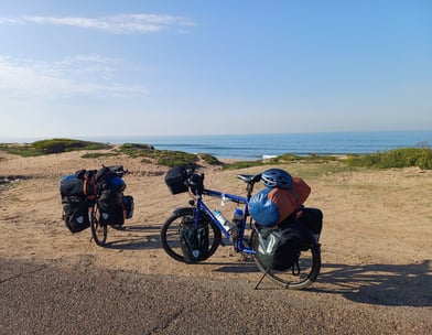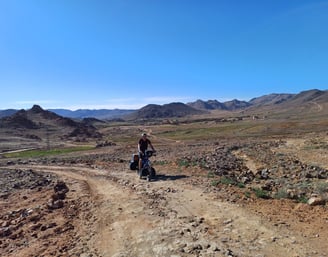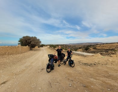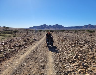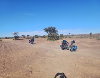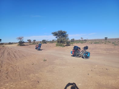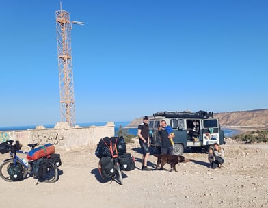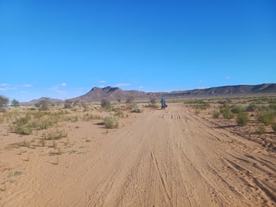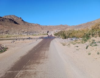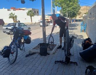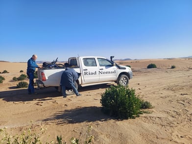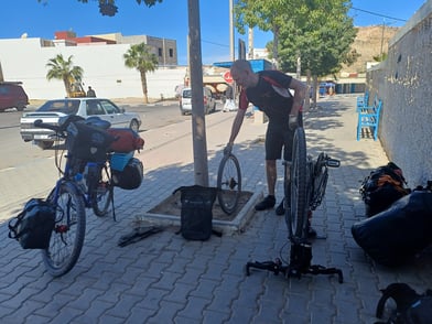Die Nacht ist arschkalt, obwohl die Klimaanlage auf 30°C bläst. Nach einem schnellen Frühstück wartet das Auto schon, und der Fahrer spricht erfreulicherweise recht gut spanisch, sodass Conni die Unterhaltung übernehmen kann. Wir haben beschlossen, uns nicht nur nach Ramlia bringen zu lassen, sondern noch 25km weiter an den Punkt, an dem die Asphaltstraße beginnt. Gemeinsam vertäuen wir die Räder so auf der Ladefläche, dass sie die wilde Schüttelei schadlos überstehen.