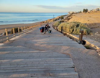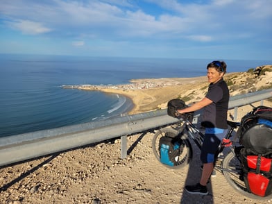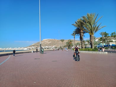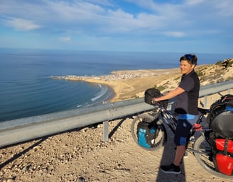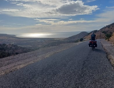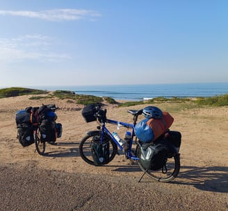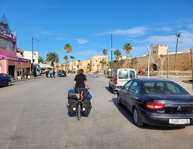 Da wir heute noch einen Bus nach Essaouira nehmen wollen, um nicht noch einmal durch eine Raffinerie und zusätzlich eine Phosphorproduktion radeln zu müssen, machen wir bis auf einen Kaffeestopp keine Pause. Erst an der Uferpromenade von Safi snacken wir eine Tüte Nüsse und fahren dann die letzten Kilometer bis zum Busbahnhof. Kaum dort angekommen, werden wir von Schleppern zu einem Bus gezerrt, der in wenigen Minuten abfährt. Die Zeit (und der Platz) reicht gerade, um Räder und Taschen sicher zu verstauen, schon sind wir unterwegs!