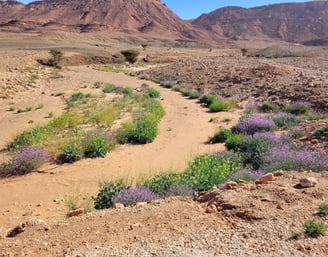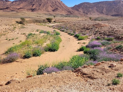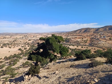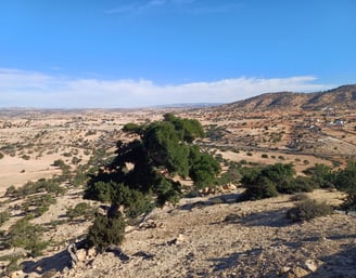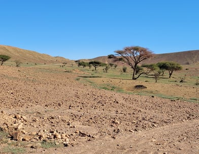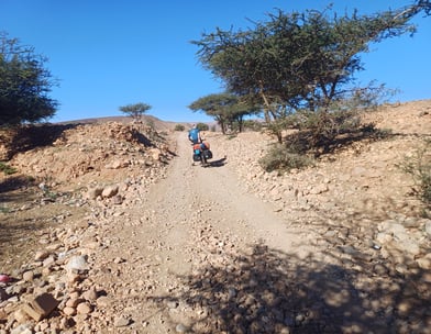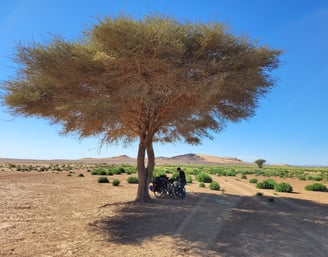 Die Straße bis Oumjrane rollt gut und macht uns Mut für den Tag. Es ist noch früh und angenehm kühl, der Wind schläft noch. In Oumjrane verfolgen uns drei Jungs mit viel Gejohle. Ihnen verdanken wir, dass wir nicht meinem GPS-Track, sondern einer kleinen Spur folgen, die sich sehr gut fahren lässt; wir kommen trotz Sand und Geröll gut voran. Um uns herum ist es erstaunlich grün. Das Wasser aus dem schweren Regen im September und Oktober ist in der Tiefe immer noch vorhanden und lässt die Wüste aufleben. Bis mittags haben wir gut 30km geschafft. Wir machen Pause unter einem der wenigen Bäume.
