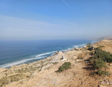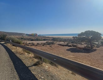 (D) Irgendwann in der Nacht hören meine Schmerzen auf. Eigentlich würde ich lieber nichts essen, um den Magen zu schonen; aber die Strecke bis nach Safi zu radeln ohne Frühstück erscheint mir auch gewagt. Also picken wir aus dem reichlichen Angebot das Beste raus und machen uns bei heftigem Nebel auf den Weg. Sofort beginnt die Straße zu steigen. Immer wieder ahnen wir im Nebel neben uns ein tief eingeschnittenes Tal mit fruchtbaren Feldern hinter der Düne. Als sich der Nebel auflöst, genießen wir den Blick hinunter über die Felder, während die Straße mit perfektem Belag in Wellen über die Steilkante verläuft.