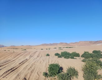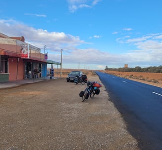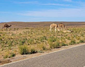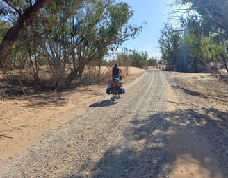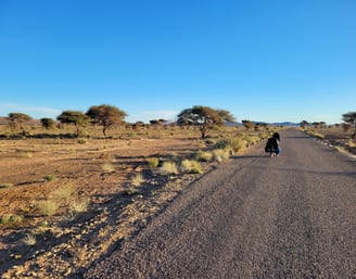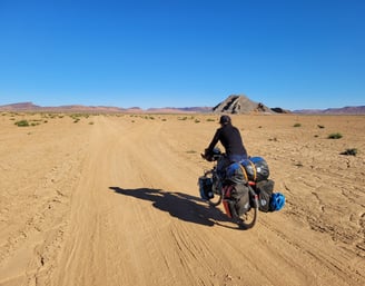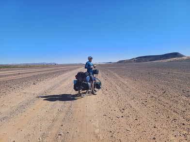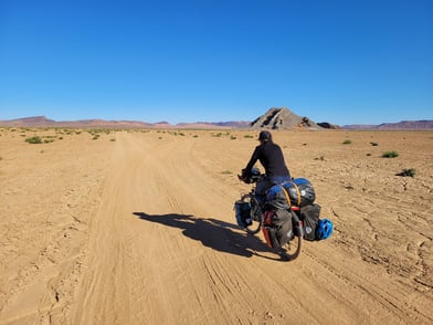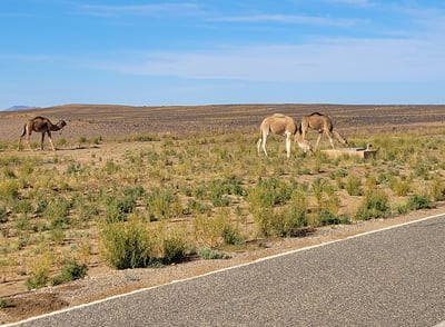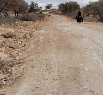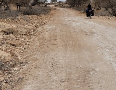Die Strecke ist unspektakulär bis langweilig, vor Allem nachdem die wunderschönen Dünen außer Sicht sind. Wir trauern der schönen Wüste und auch dem Radfahrteil unserer Reise ein bisschen hinterher und radeln teils in Gedanken, teils ins Gespräch vertieft relativ flach vor uns hin.