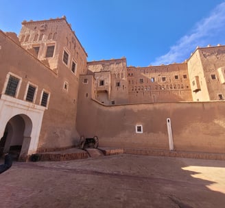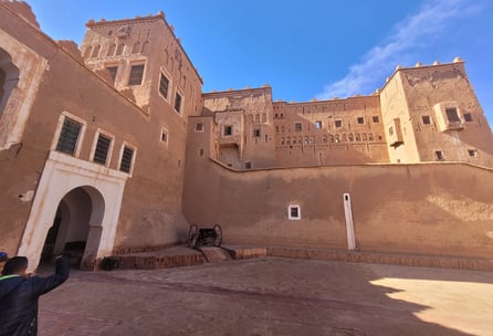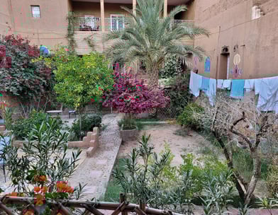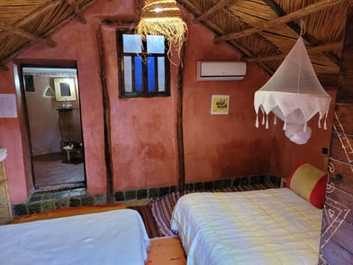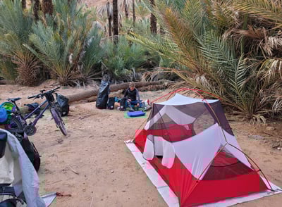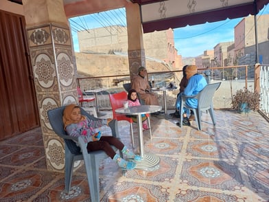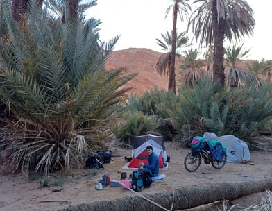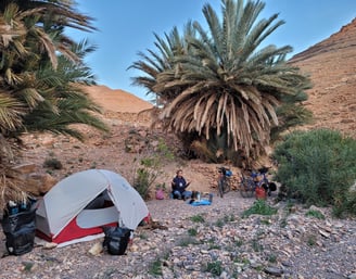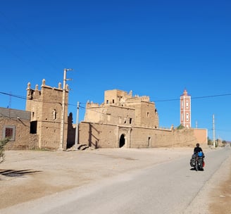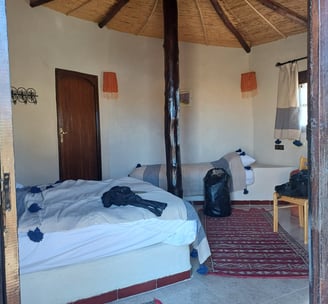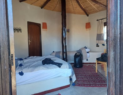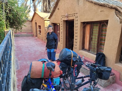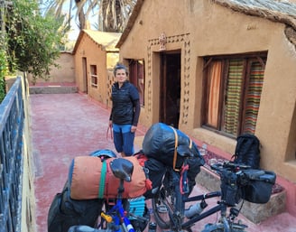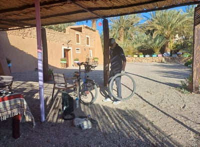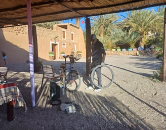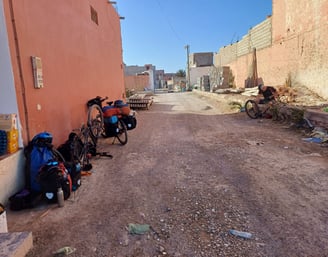 Als wir uns dem Ziel nähern, spricht uns ein Mensch mit Moped an, ob wir das Riad Zaouia suchen. Das ist unser Glück, denn den Weg durch winzigste verwinkelte Gassen, den er uns führt, hätten wir lange gesucht! So kommen wir viel früher an als geplant und haben Zeit, uns mit dem Wirt über unseren Plan zu unterhalten, durch die Wüste zu radeln. Er ist skeptisch, hat aber mehrere Tipps, wo wir Menschen finden können, die uns mit dem Jeep weiterbringen, falls es uns zu hart werden sollte. Damit ermutigt er uns letztlich, es zu probieren. Nach einem frühen Abendessen verschwinden wir im Bett, um uns für morgen auszuschlafen.