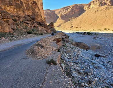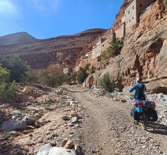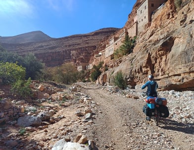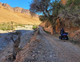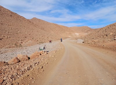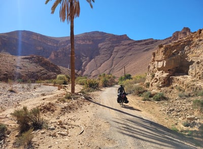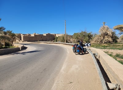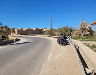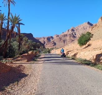 (D) Wir brechen früh auf, denn der heutige Weg ist lang. Es gibt zwei mögliche Wege nach Zagora, rechts und links des Flusses. Der linke Weg wurde uns von unserem Führer in der Kasbah von Ouarzazate empfohlen, er sei viel schöner mit weniger Verkehr. Also hatten wir es so geplant. Der rechte Weg dagegen führt über die Nationalstraße, die wir gestern schon gefahren sind und die vor Agdz mit perfektem Asphalt geglänzt hatte. Wir fragen also unseren heutigen Wirt nach seiner Meinung, und die ist klar: mit dem Rad bloß nicht den linken Weg!