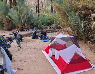 Dann ist die Straße erreicht. Beim Hotel Porte de Sahara laden wir ab, verabschieden uns und bestellen dann erstmal einen Pott Tee, zu dem es reichlich Gebäck und eine magere Hündin gibt, mit der wir das Gebäck teilen. Es ist schon Mittag und wir radeln bewusst langsam los. Bis Merzouga sind es etwa 50km mit wenigen Höhenmetern, also kein Problem. Unser Freund, der Gegenwind, der gestern Ruhetag hatte, ist wieder da, und wir merken, dass wir den fünften Tag in Folge auf den Rädern sitzen und die Kräfte zu Ende gehen. Wir wechseln uns mit der Führung ab, machen eine lange Pause, aber trotzdem fällt das Fahren nicht leicht. Einmal sitzen wir für eine halbe Stunde neben einer Baumgruppe und überlegen, hier zu zelten und erst morgen weiterzufahren. Aber ein Schwarm winziger Fliegen quält uns, und die Aussicht auf einen ganz freien Tag morgen in Merzouga lockt uns. Dort gibt es riesige rotgelbe Dünen, die sich ohne Rad erwandern lassen. Also fahren wir weiter und erreichen Merzouga am späten Nachmittag. Wir finden ein wunderschönes Hotel direkt an der Düne, bekommen ein eigenes kleines Hüttchen mit tollem Bett und ein leckeres Abendessen. Das Hotel gehört einem Franzosen und seiner Mutter, und wir stellen fest, dass wir uns in einem „europäischen“ Hotel noch ein bisschen geborgener fühlen!