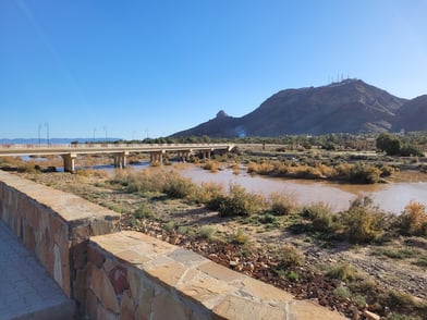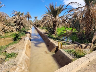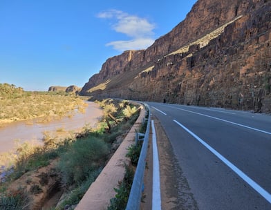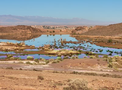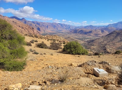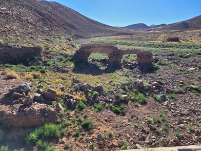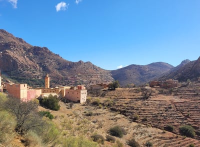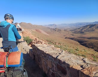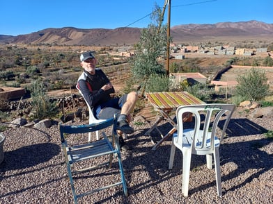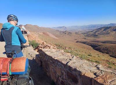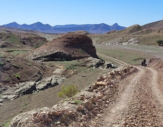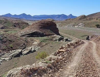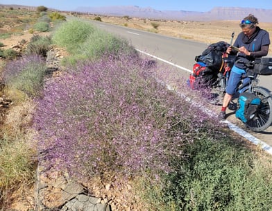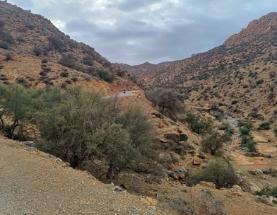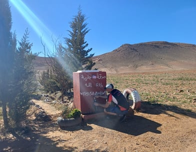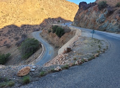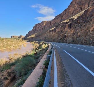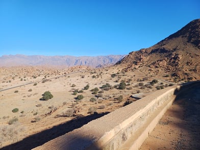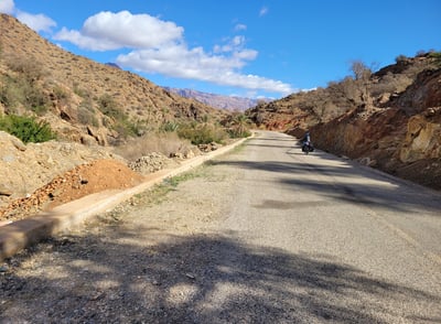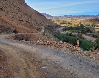 Die Strecke windet sich schön langsam entlang des Flusses Draa aus den Bergen hinaus. Es hat erfreulich wenig Höhenmeter und viel Wasser. Wir fahren betont defensiv, denn die Planung sagt 105km voraus und der Wind ist eisig und wird im Laufe des Tages immer stärker. So brauchen wir für die ersten 30km fast zwei Stunden. Wir machen die erste Kaffeepause und richten uns auf bis zu sieben Stunden Fahrt ein. Nach guten drei Stunden machen wir eine Mittagspause. Wir setzen uns in die Sonne, denn vom Wind sind wir so ausgekühlt, dass wir im Schatten frieren.
