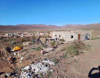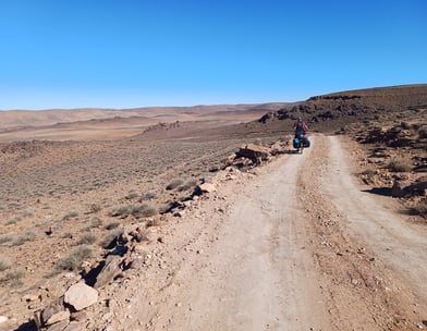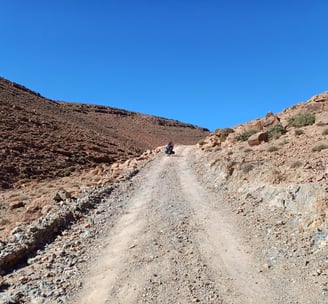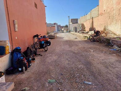 Wir erreichen den Abzweig auf die Piste nach 16 Uhr. Es sind jetzt noch 18km bis nach Tissmoumine, von dort soll es nochmal eine Asphaltstraße bin nach Oumjrane geben. Wir hoffen, dass wir es heute noch bis dorthin schaffen werden, denn dort gibt es eine Übernachtungsmöglichkeit. Die Piste ist über weite Teile eine tief ins Gelände eingeschnittene Rinne voller großer Steine, dazwischen gibt es leider auch einige sandige Abschnitte, die wir schieben müssen. Wir zirkeln mit voller Konzentration im Stehen Meter für Meter durch diesen Parcours. Als am Horizont endlich Häuser zu sehen sind, geht die Sonne schon bald unter. Wir steuern in Tissmoumine, begleitet von dutzenden lärmenden und bettelnden Kindern, auf das einzige Haus zu, dass nach einem gastronomischen Angebot ausschaut und fragen, ob wir hier übernachten können. Offensichtlich schauen wir bedürftig genug aus, denn obwohl dies nur ein rudimentäres Café ist, bietet der nette spanischsprachige Wirt uns einen Platz für die Nacht an. Der besteht aus den Sofas des im Nachbarhaus allein lebenden Onkels. Wir sind froh, bekommen noch ein Omelette und Kaffee, duschen uns mit einem Schlauch ohne Duschkopf, aber immerhin heißem Wasser, und hoffen auf ein besseres Morgen. Im Wohnzimmer ist es überraschend bequem. Der Onkel versucht noch, uns Gesellschaft zu leisten, bringt Tee und Obst, scheitert aber letztendlich an der Sprachbarriere.