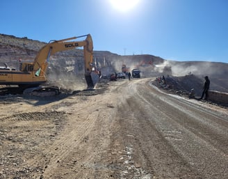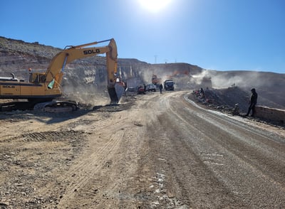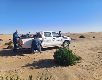 Und es wird eine echte Achterbahnfahrt! Unser Fahrer brettert lässig mit Vollgas über eine Piste ähnlich der, die wir gestern geschoben haben, nur noch viel sandiger. Er scheint hier jeden Meter zu kennen, fährt für uns unerklärliche Schlangenlinien, bremst plötzlich für ein einzelnes Loch, und erklärt uns währenddessen die Umgebung, erzählt von den Platinminen in den Bergen und der algerischen Grenze, weist auf Dromedare und Ziegenherden hin. Richtig spannend wird es dann im Flussbett. Hier wühlt sich der Pickup durch hüfthohen Sand, über kurze, 2 Meter hohe Wellen, zwischen denen man leicht die Orientierung verlieren könnte, denn es verlaufen Spuren in alle Richtungen. Die Frage, wie oft er hier langfährt, versteht unser Fahrer erst nicht, bis klar wird, dass er diese Strecke jeden Tag und immer wieder fährt; es ist quasi sein Arbeitsplatz. Irgendwann kommen wir an einem Auspuff vorbei, den jemand hier im Sand verloren hat. Der wird gleich eingepackt, kann man bestimmt noch brauchen.