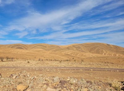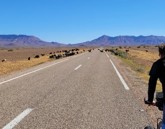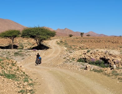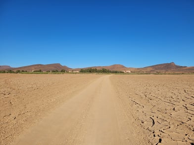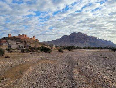 (D) Es ist noch bitterkalt, als wir losfahren. Aber die heutige Etappe bis Oumjrane ist sehr lang und auch heute soll es wieder Gegenwind haben. Außerdem geht es Conni nicht sehr gut. Wir kaufen noch Wasser, Saft und Brot ein, und dann geht es aus Zagora nach Osten in Richtung Wüste.