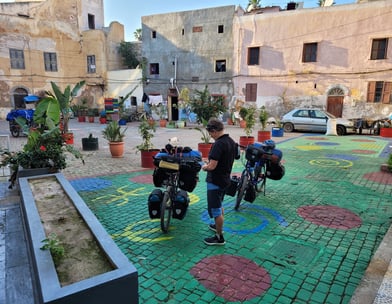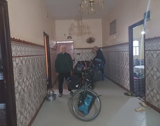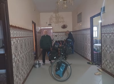 (D) Als wir gegen halb sechs in Fès ankommen, sind wir ziemlich kaputt; im Bus schläft es sich doch nicht wirklich gut. Wir packen die Räder auf und rollen knapp sechs km bis zum Maison Adam, wo wir uns für drei Nächte eingemietet haben. Zweimal hatten wir hin und her geschrieben, hatten die vergangene Nacht bereits gebucht, um sicher zu gehen, dass wir um diese Zeit eingelassen werden und schlafen können. Aber als wir die richtige Tür gefunden haben (mit Hilfe zweier recht angetrunkener junger Männer) dauert es ewig, bis wir den Inhaber wachgeklingelt haben. Wir packen die Räder ab, stellen sie nach seinen Plänen in den zentralen Raum des Hauses, und fallen ins Bett.